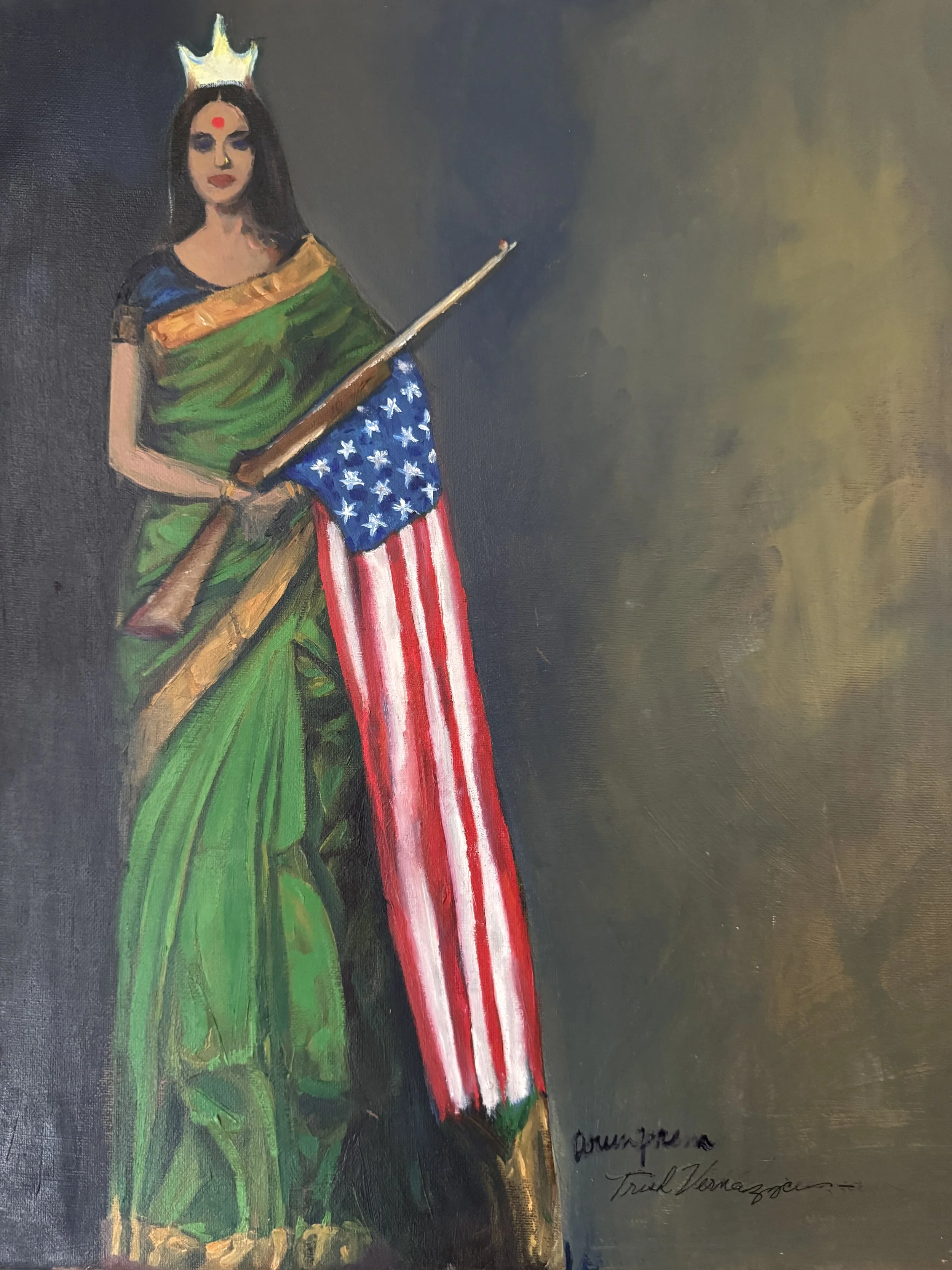 I bought this painting at Goodwill of a woman in a green dress to use as a canvas. These piece is a remix of another person's art that appeared to be learning how to paint a female figure. It reminded me of a beauty pageant contestant and our Statue of Liberty. Instead I added color to her skin, gold crown, rifle and an American Flag. I put the red dot on her head as laser sight as I created this during Black Lives Matter, as we had targets on our people of color. The red dot also could be the mark of an married Indian woman, immigrating to America. We have so much controversy surrounding gun control, immigration, marking people, police, politics, gender, identity as we continue to combat all this confusion even toda