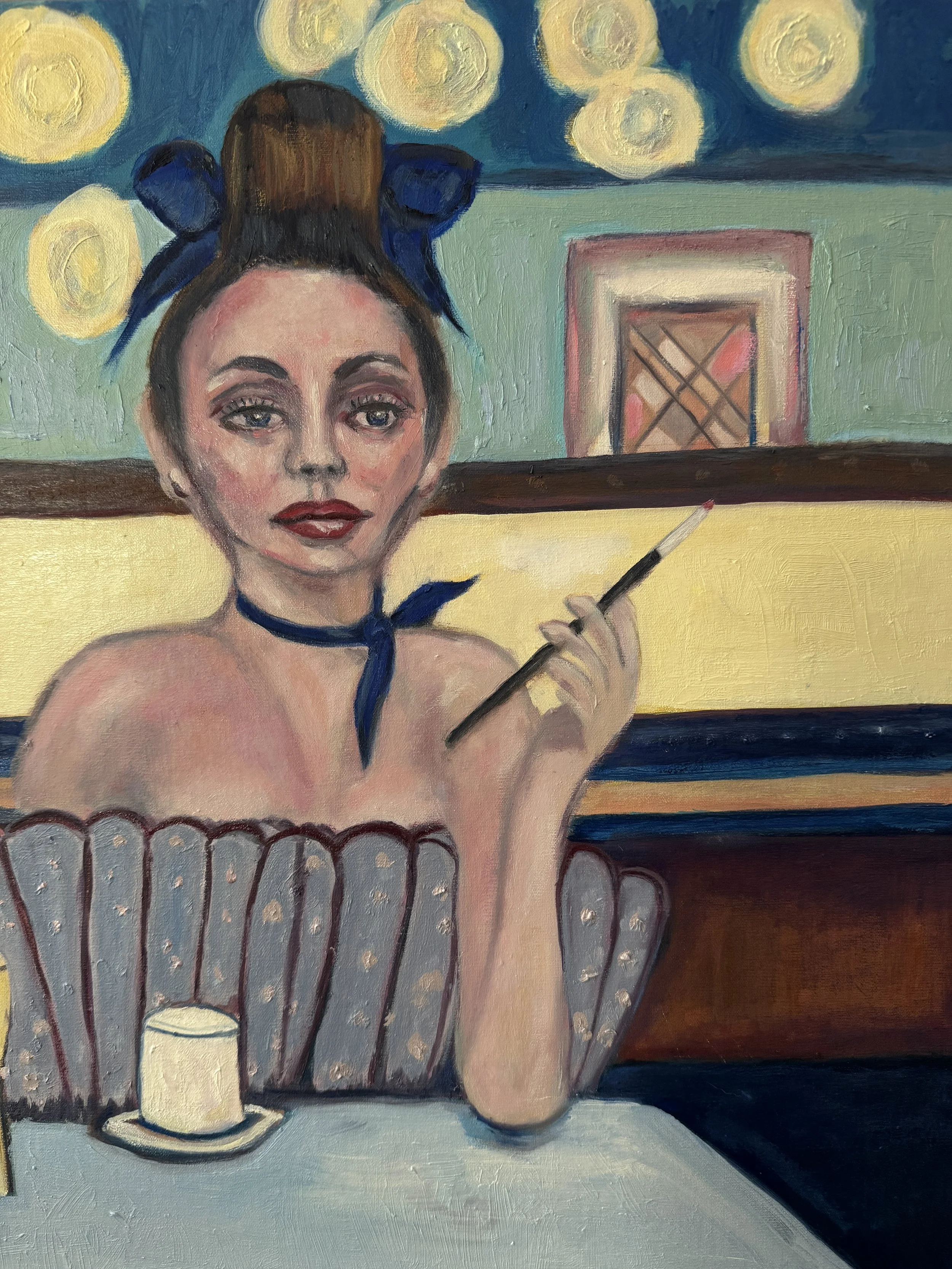 Her gaze steady yet distant. She holds her cigarette holder like a prop of confidence. The pastel hues and blurred edges of the cafe around her hint of fleeting conversations and the hum of possibilities. In this brief pause between introductions, she seems caught between hope and detachment.