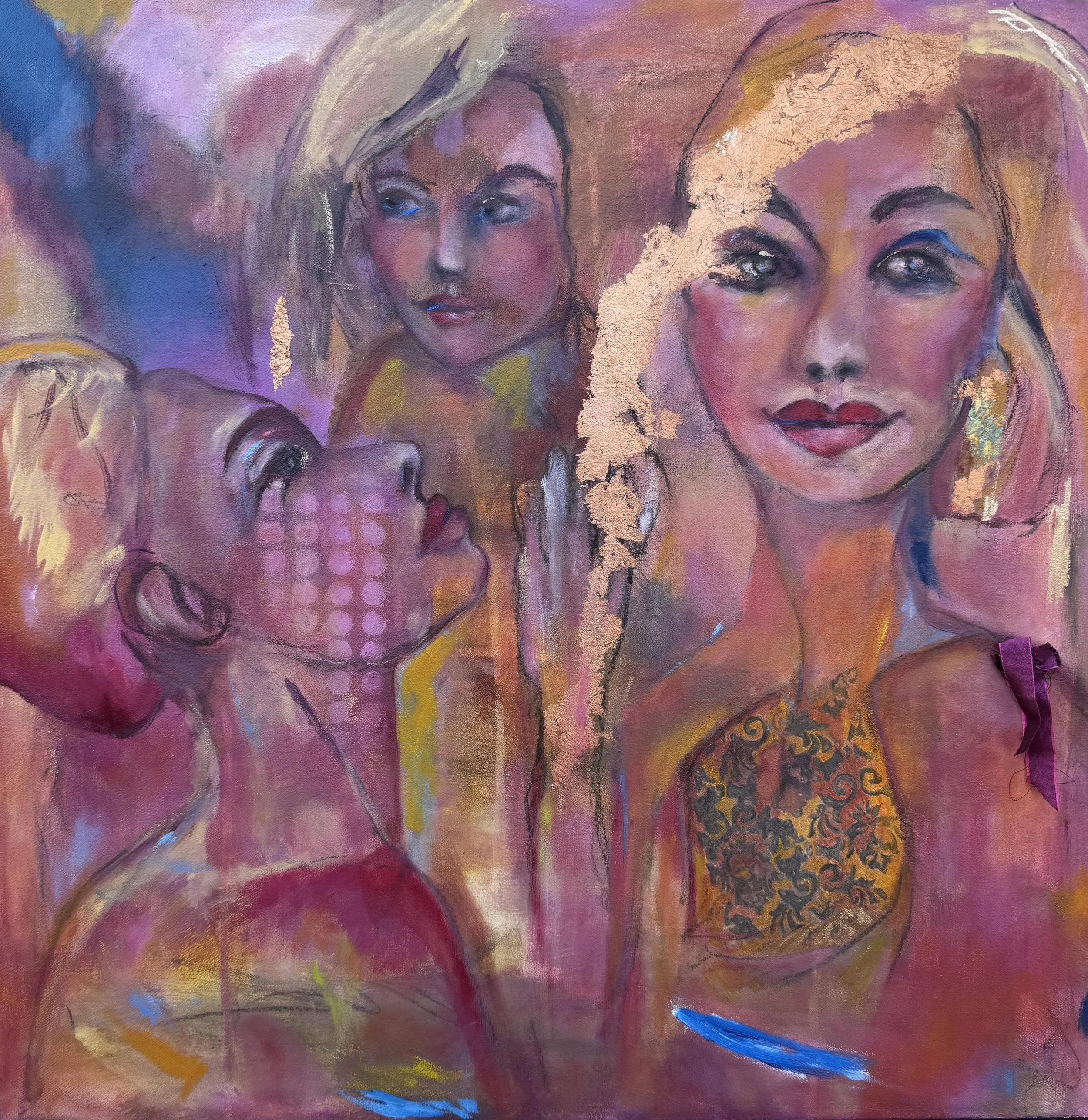 In a haze of rose and gold, three women drift between worlds, the real and the imagined, the seen and the felt, their faces, touched by fragments of light and shadow, seem to whisper secrets only intuition can hear. One gazes upward, caught in the trance of wonder; another looks outward, serene and knowing; the third lingers between them, an echo of thought suspended in dream.