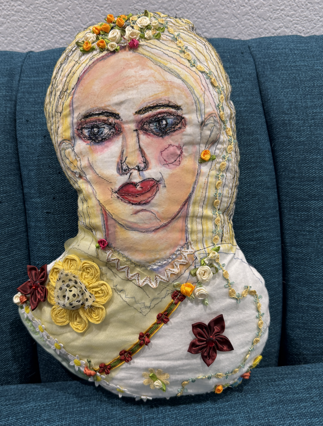 Fabric self portrait of sun flower girl inspired by the Ukrainian women who offered the Russian solider sun flower seeds reminding them once planted, but the Ukrainian may be gone but there souls and spirits will forever bloom on the growing sun flowers.