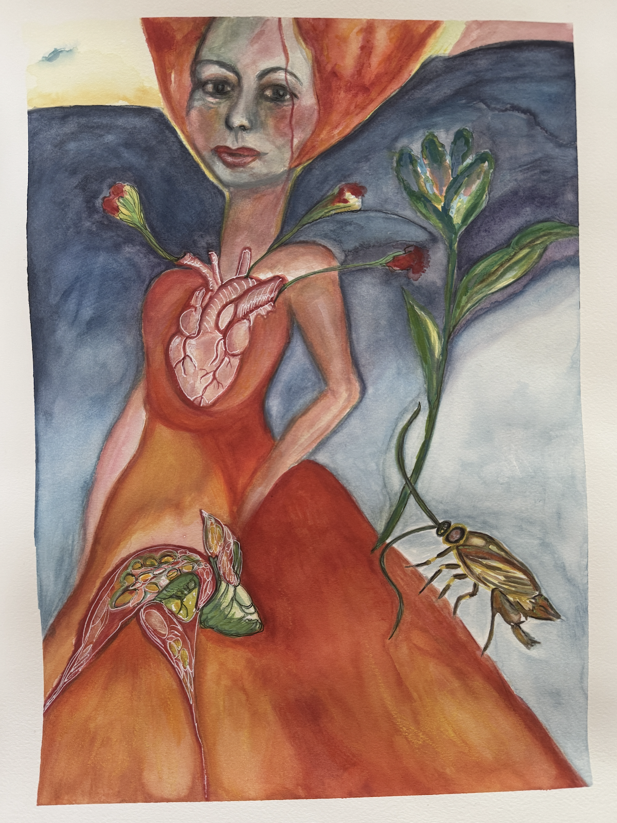 As her heart grows outward, threading into petals and stems. She calmly listens to the quiet language of wings and roots.